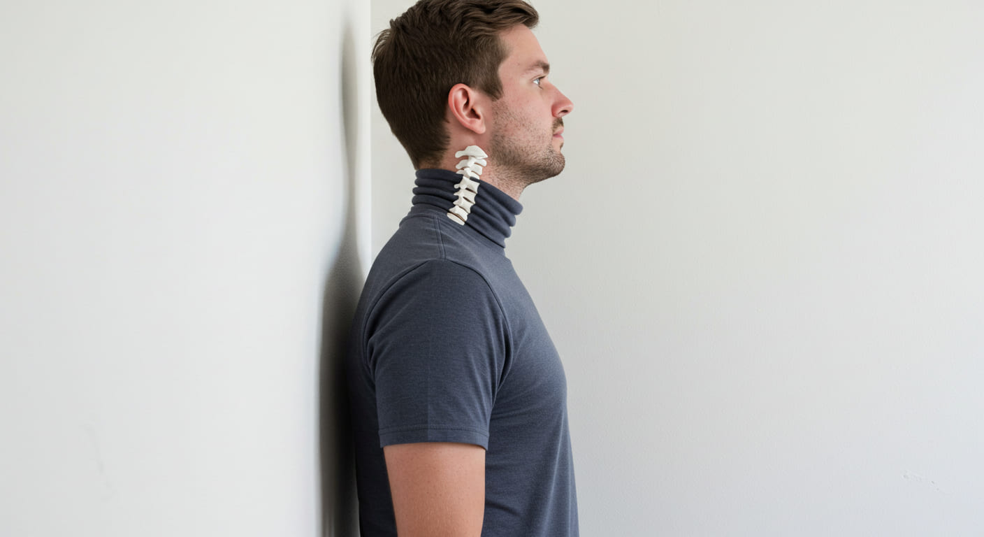 - 벽 테스트: 벽에 등을 붙이고 서서 뒤통수, 어깨, 엉덩이, 종아리 뒤, 발뒤꿈치가 벽에 닿게 합니다. 이 자세에서 뒤통수와 벽 사이의 간격이 크다면 거북목일 가능성이 높습니다.
