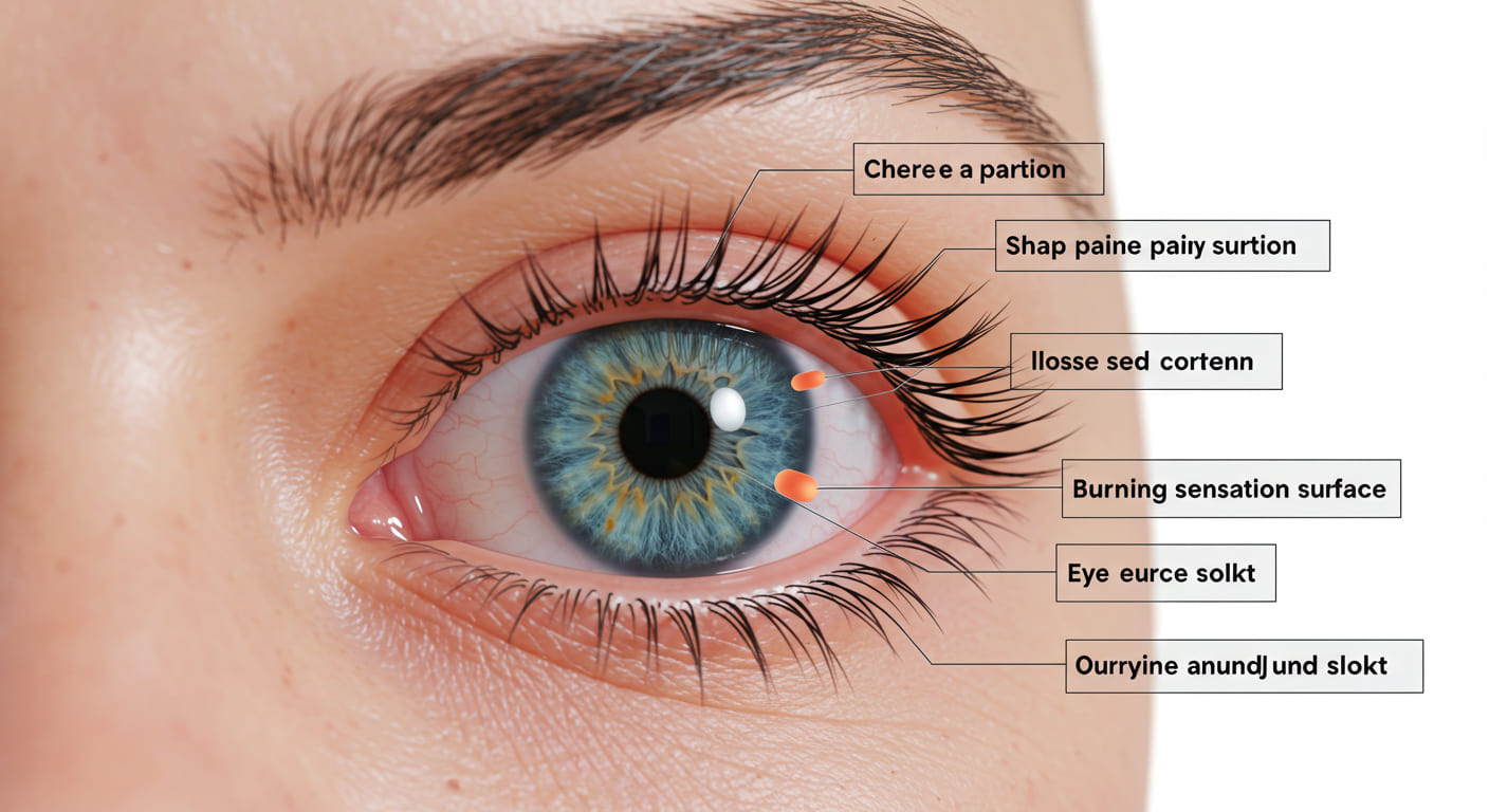 각막 손상은 눈 표면의 작은 긁힘이나 찰과상으로, 콘택트렌즈 착용, 이물질, 또는 눈을 문지르는 행동으로 발생할 수 있습니다. 각막은 신경 분포가 매우 풍부하여 작은 손상에도 심한 통증을 유발합니다. 눈을 깜빡일 때마다 눈꺼풀이 손상된 각막을 자극하여 날카로운 통증이 발생합니다.