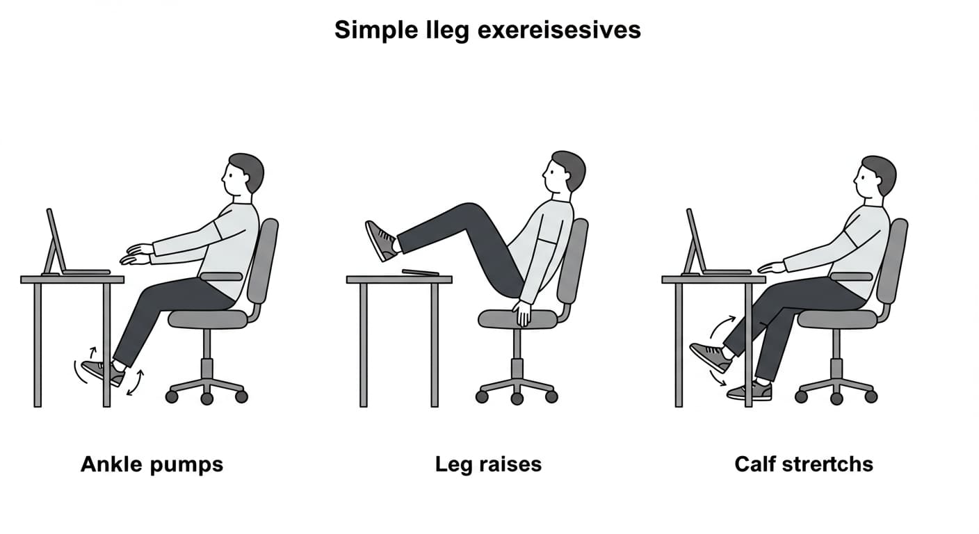 1. 침대에서 발목 돌리기 (좌우 각 10회) 2. 다리 들어올리기 (10회) 3. 압박 스타킹 착용 4. 따뜻한 물 한 잔 마시기