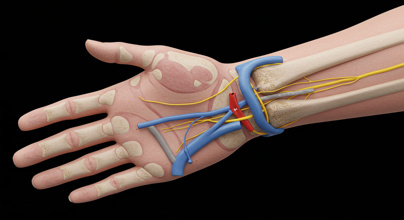 손목터널이란 손목 부위에 있는 좁은 통로로, 이곳을 통해 정중신경(median nerve)과 여러 힘줄이 지나가게 됩니다. 이 통로가 어떤 이유로 좁아지거나 내부의 조직이 부어오르면, 정중신경이 압박을 받게 되고 이로 인해 다양한 증상이 발생하게 됩니다.