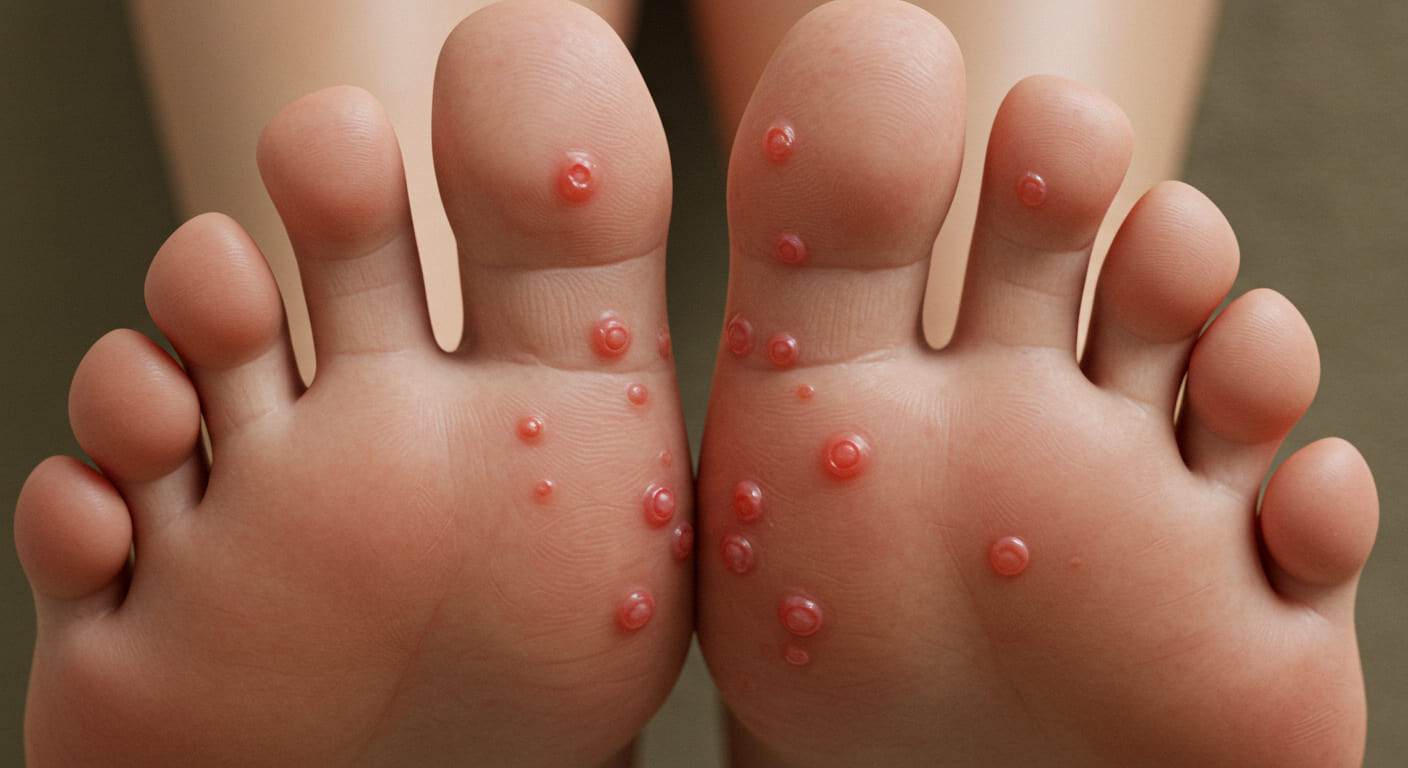 초기에는 손바닥이나 발바닥에 작은 붉은 반점으로 시작하여 점차 주변으로 퍼져나가며, 수포로 발전합니다. 수포는 보통 2-3mm 크기의 타원형이나 원형으로, 물집처럼 보이지만 대개 가려움증은 심하지 않습니다.