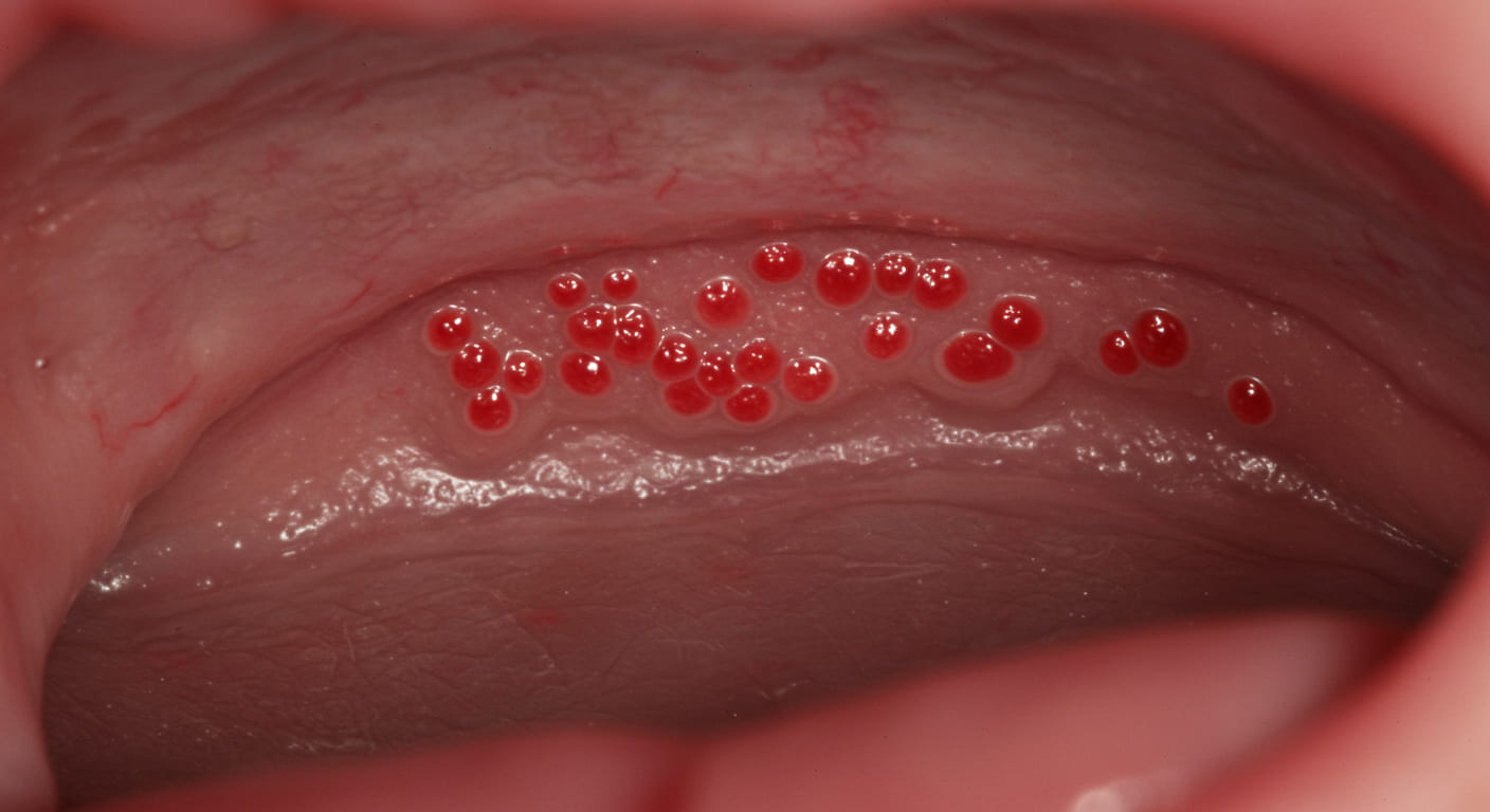 목 통증과 함께 입 안에 작은 궤양이나 수포가 발생할 수 있습니다. 아이가 갑자기 음식 먹기를 거부하거나, 물을 마실 때 불편해하는 모습을 보인다면 입 안을 살펴보세요. 혀, 잇몸, 뺨 안쪽, 입천장 등에 붉은 반점이나 수포가 보일 수 있습니다. 이런 구강 내 병변은 매우 통증이 심할 수 있어, 아이가 음식 섭취를 거부하는 주된 원인이 됩니다.
