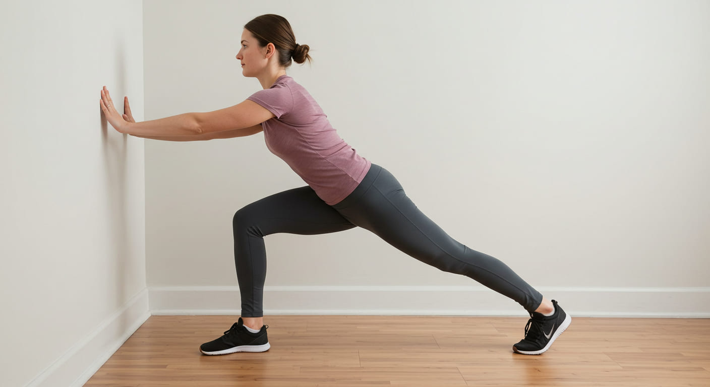 벽에 손을 대고 서서 한쪽 다리를 뒤로 뻗어 발꿈치를 바닥에 붙입니다. 무릎을 펴고 몸을 앞으로 기울여 종아리가 늘어나는 느낌이 들 때까지 자세를 유지합니다. 30초간 유지 후 천천히 풀고, 양쪽 다리에 각각 3회씩 반복합니다.
